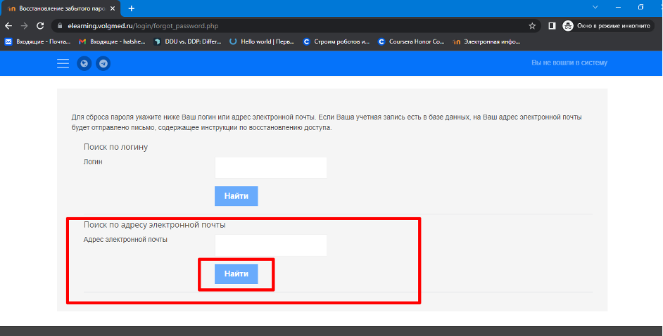 2. Вписать свою почту в окно для адреса почты и нажать кнопку «Найти»