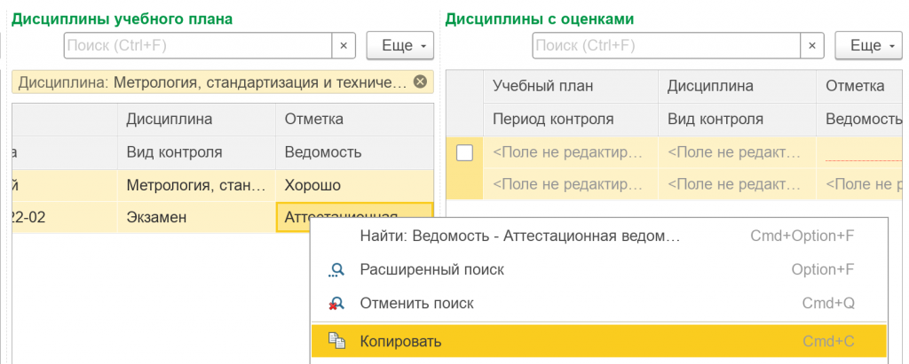 1. Выполнить перезачёт оценок в соответствии с инструкцией ( Инструкция по заполнению Оценок находится по здесь. )2. Найти нужную ведомость, нажать на неё правой кнопкой и «Копировать».