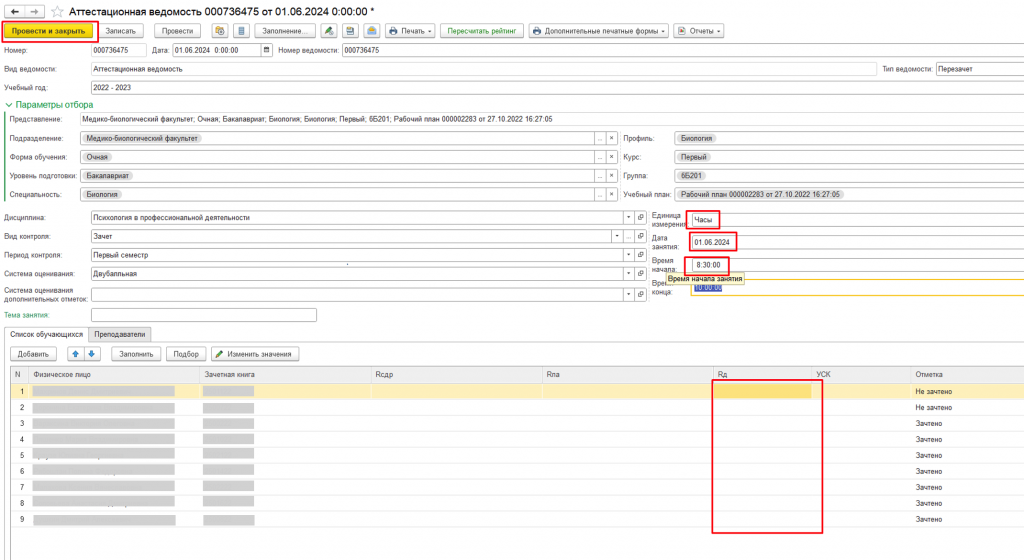 6. Заполнить Единицу измерения, Дату занятия, Время начала и столбец Rд, нажать Провести и закрыть