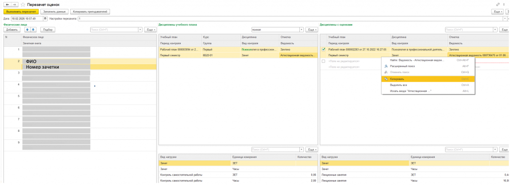После нажатия кнопки «Перезачет» в полях «Дисциплины с оценками» данные могут не отобразиться