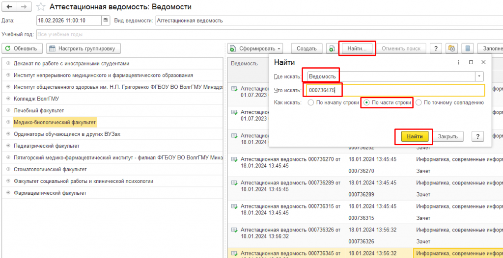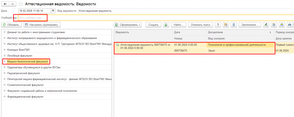 5. Стереть учебный год, выбрать нужный факультет в дереве слева и войти в ведомость.
