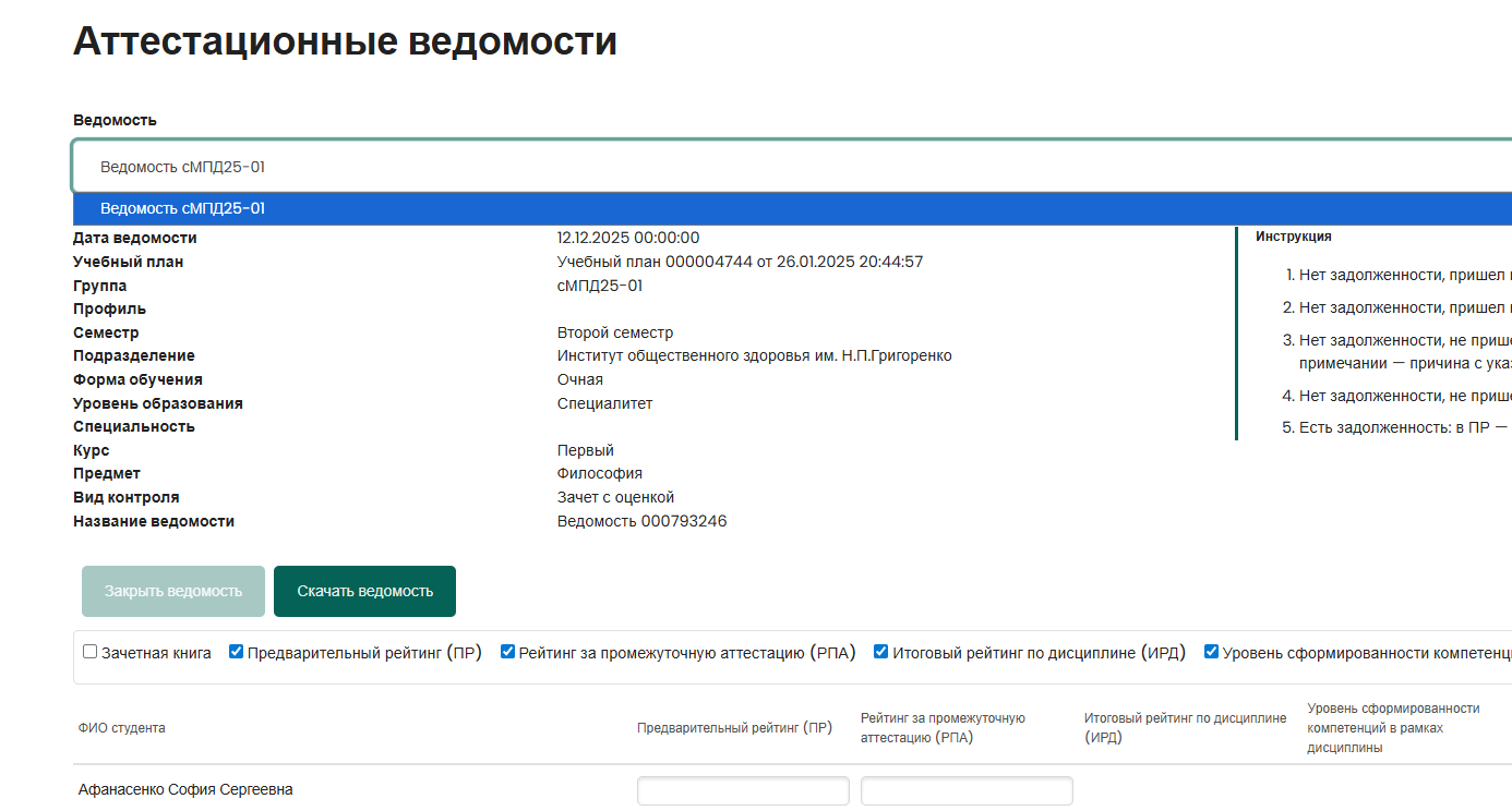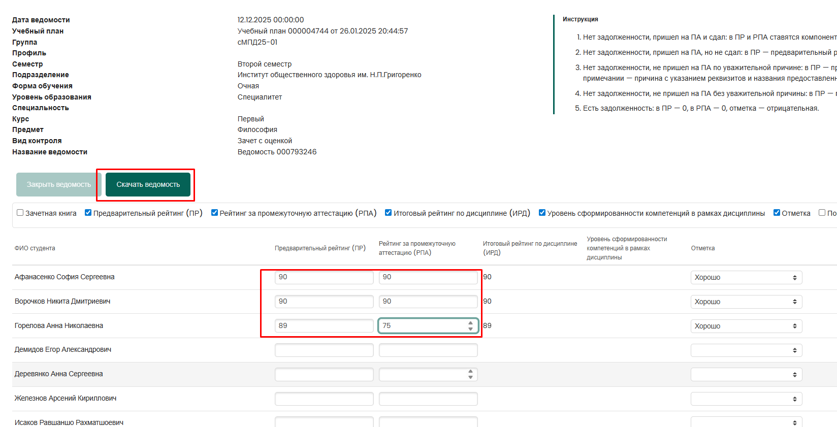 3. Внести рейтинги студентам и нажать кнопку Скачать ведомость.
